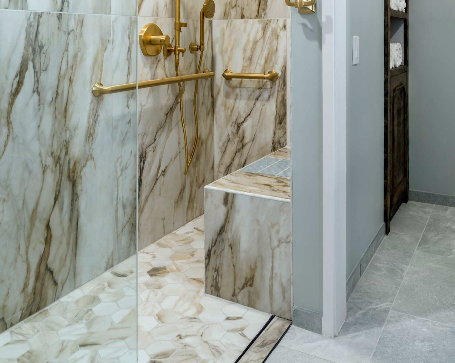 • Accessible bathroom with lowered vanity, roll-in shower, built-in shower chair, and grab bars for shower and water closet